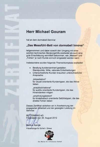 Michael Gouram wurde am 1.10.1999 nach seiner Lehre als Textil-Einzelhandels-Kaufmann bei der Firma BETTEN-SAUER als Fachverkäufer eingestellt und exakt vier Jahre später Assistent der Geschäftsleitung. Im Laufe der Jahre besuchte er unzählige Seminare, Möbel- und Textilmessen sowie eine Vielzahl von Bettenherstellern. Um unsere Azubis auszubilden legte er die Ausbilder-Eignungsprüfung ab, ebenfalls die Prüfung als Handelsassistenten und als „diplomierter Schlafberater“. Am 1. Januar 2014 hat er die Firma als Inhaber und alleiniger Geschäftsführer übernommen.